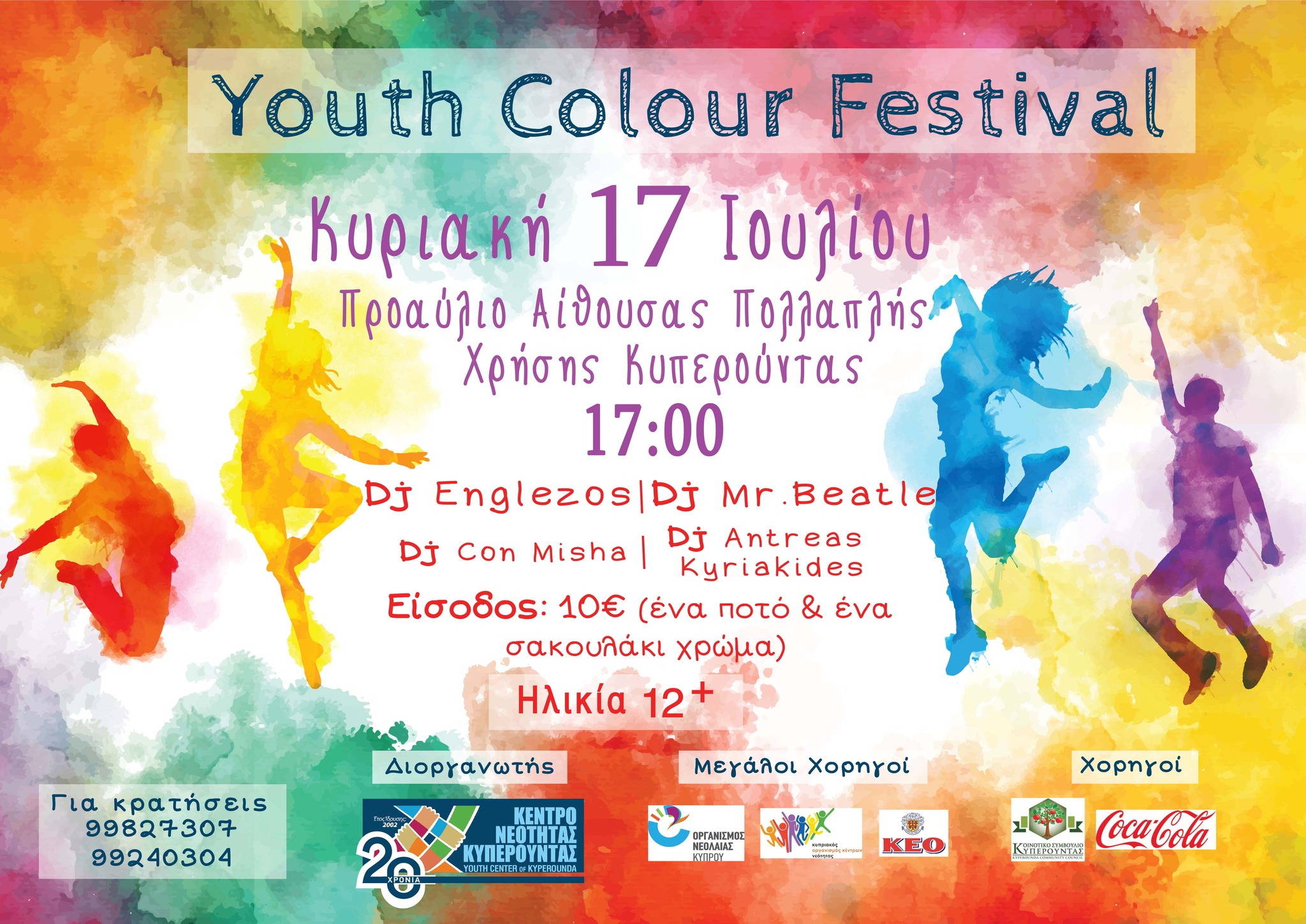 Το Κέντρο Νεότητας Κυπερούντας επαναφέρει το πιο διασκεδαστικό event του καλοκαιριού! Στο προαύλιο της αίθουσας πολλαπλής χρήσης στην Κυπερούντα θα στηθεί ξανά το Youth Colour Festival με μουσική, ποτό και street food από τις 5μμ μέχρι αργά το βράδυ.